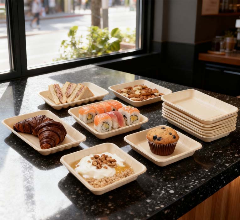 From sushi bars to bakeries, from cafes to catering — the 104 Bagasse Tray delivers nature’s design in perfect harmony with modern foodservice.