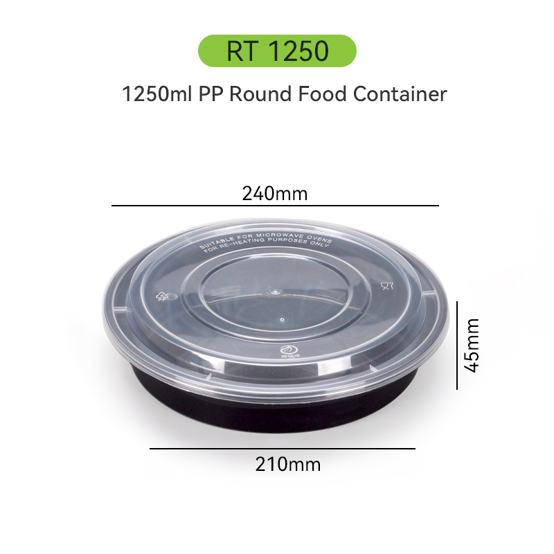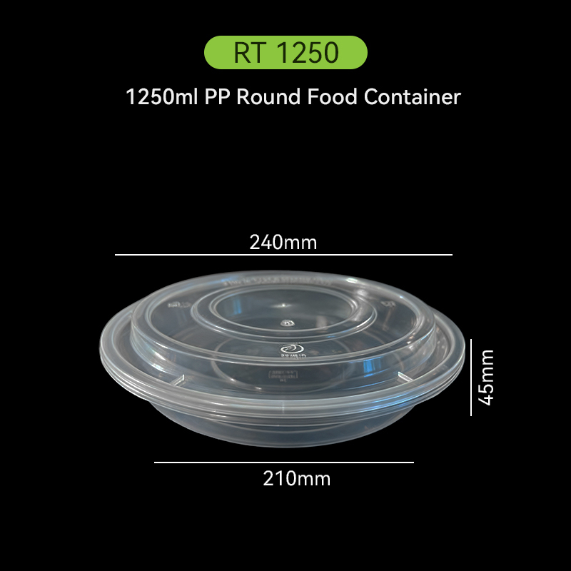 | 1 | Round Food Container 1250ml | RT 1250 | PP | 240*210*45 | 1250 | Transparent / Black / White | 90 |