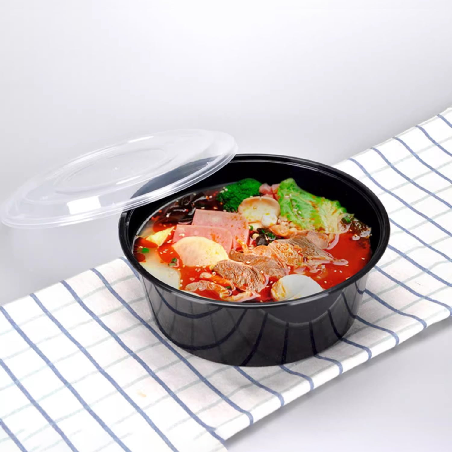 While made from durable PP plastic, the 1250ml round disposable container is fully recyclable under standard recycling programs. PP (polypropylene) is widely recognized as one of the more environmentally preferable food packaging plastics due to its light weight, low carbon footprint during production, and ability to be recycled into various new materials.