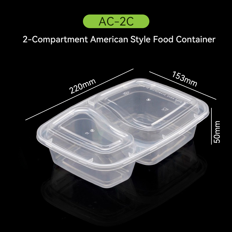 | 1 | 2-Compartment American Style Food Container | AC-2C | PP | 220*153*50 | Transparent / Black | 150 |