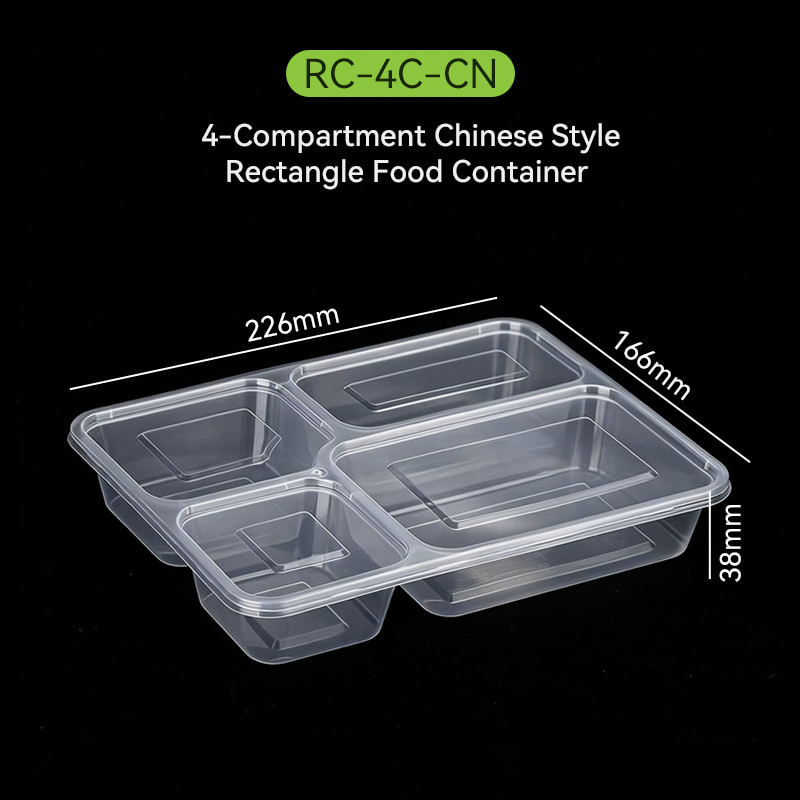 | 6 | 4-Compartment Chinese Style Rectangle Food Container | RC-4C-CN | PP | 240*188*38 | Transparent / Black | 150 |