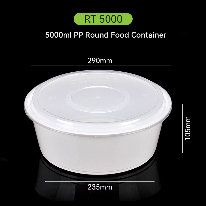 | 9 | Round Food Container 5000ml | RT 5000 | PP | 290*235*105 | 5000 | Transparent / Black / White | 60 |