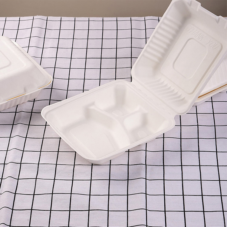The 8 Inch 3-Compartment Clamshell (X083) is an eco-friendly, biodegradable food packaging solution made from sugarcane bagasse. This innovative design features three compartments, which help in preventing food from mixing, ensuring that different food items maintain their distinct taste and texture. Ideal for fast food, takeout meals, and meal kits, this clamshell box provides a convenient and sustainable packaging solution for a wide range of food items. The clamshell box is temperature-resistant from -20°C to 120°C, offering versatility for both hot and cold foods. With its sleek design, this packaging ensures convenience and enhances food presentation while aligning with green, sustainable packaging goals.