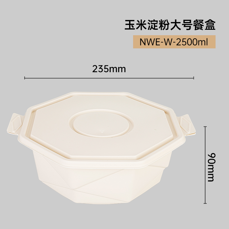 The product code is NWE-W-2500, which means it is an octagonal bowl with a very large capacity that can hold 2500ml of food. The specifications of this product are 235 * 90mm, with a diameter of 23.5 centimeters and a height of 9 centimeters, similar to the size of a small pot. This lunch box is made of environmentally friendly grade corn starch material, I hope you will like it.